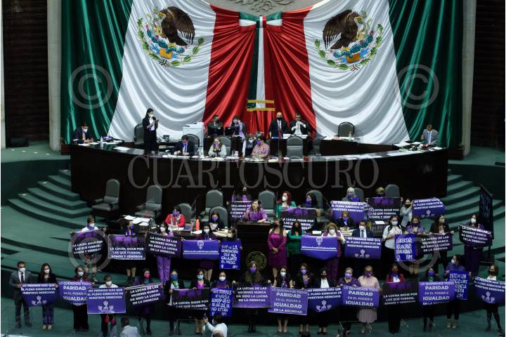 Julieta Kristal Vences Valencia, diputada de Morena, e integrantes del mismo grupo parlamentario, durante su participación para referirse a la conmemoración del "Día Internacional de la Mujer".