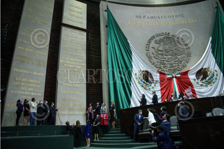 Develación en el muro de honor con letras de oro los nombres “Hermila Galindo Acosta y Elvia Carrillo Puerto”.