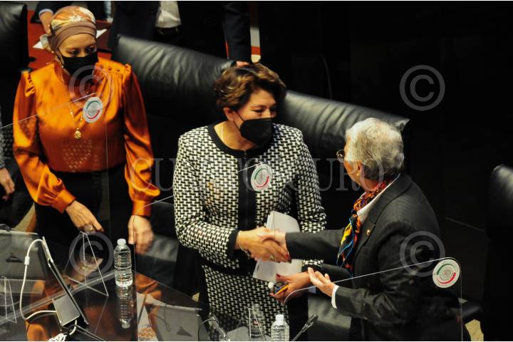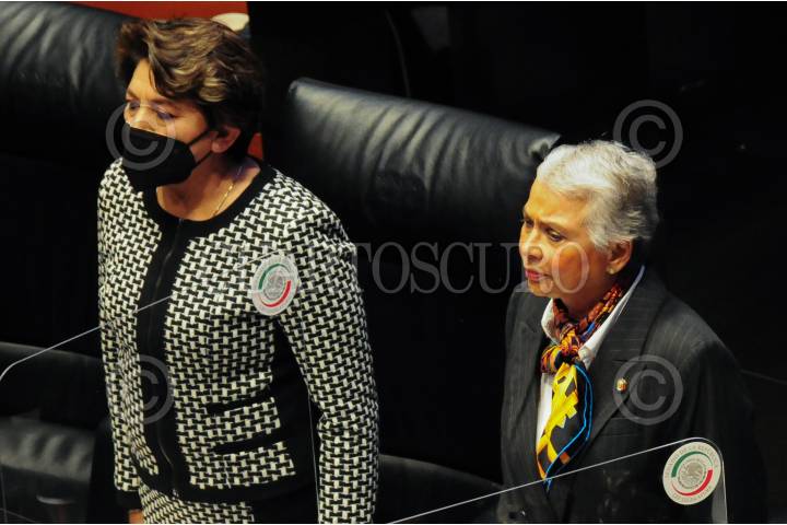 Delfina Gómez, titular de la SEP y Olga Sánchez Cordero, presidenta de la Mesa Directiva del Senado, durante la sesión Solemne.