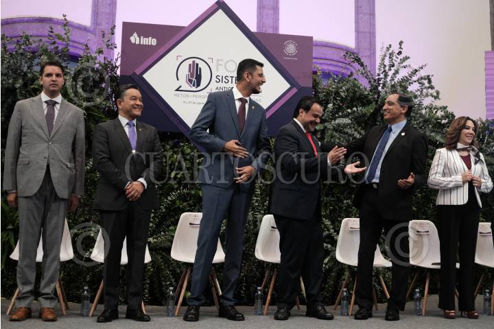 CIUDAD DE MÉXICO, 19AGOSTO2019.- Arístides Rodrigo Guerrero García, comisionado INFO; Raúl Contreras Bustamente, director de la Facultad de Derecho; Carlos Castillo Pérez, presidente de la Comisión de Transparencia y Combate a la Corrupción en el Congreso local; Julio César Bonilla Gutiérrez, comisionado Presidente del INFO; Héctor Villegas Sandoval, consejero Jurídico y de servicios legales en la capital, y Blanca Lilia Ibarra, comisionada del INAI, durante la inauguración del Foro de Sistemas Anticorrupción, el cual se realizó en el Museo de la Ciudad de México. FOTO: GRACIELA LÓPEZ /CUARTOSCURO.COM