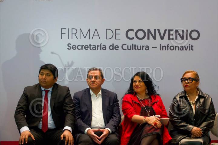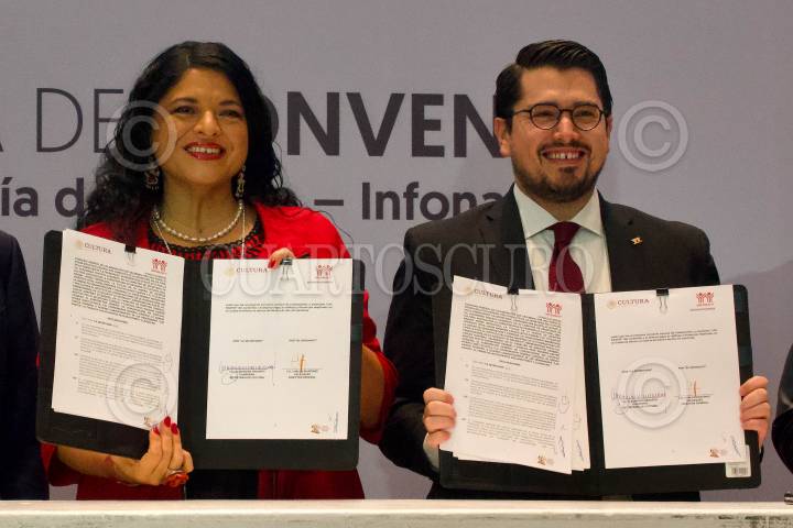 Alejandra Frausto y Carlos Martínez Velázquez, durante la firma de convenio entre el Infonavit y la Secretaria de Cultura.