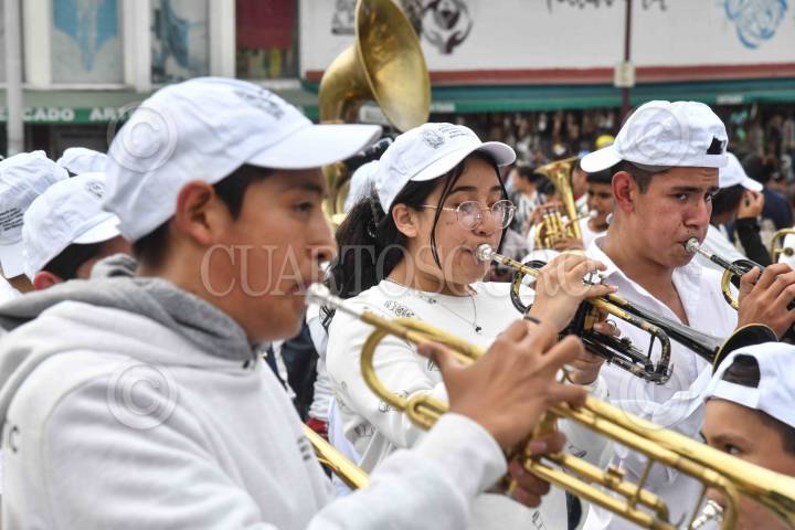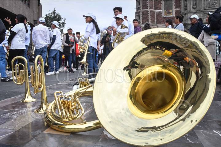 CIUDAD DE MÉXICO, 02DICIEMBRE2023.- Un conjunto de niños y jóvenes de la Escuela Infantil y Juvenil de Música de Banda “Rebeca Camacho Ocaña” de Tlalpujahua, Michoacán, acompañados de sus padres y familiares, arribaron a la Basílica de Guadalupe para orar y agradecer a la Vírgen de Guadalupe. Ésto previo a la celebración del 12 de diciembre. El proyecto de la música en banda por parte de la escuela busca alejar de la criminalidad que se vive en el pais a niños y adolescentes. FOTO: MARIO JASSO/CUARTOSCURO.COM