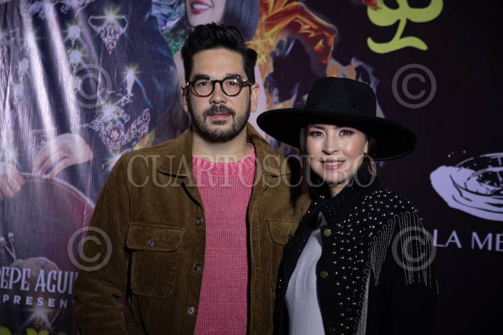 Pedro Ortíz de Pinedo y Andrea Torre a su paso por la alfombra roja de invitados especiales al espectáculo "Jaripeo sin fronteras", en la Plaza México.