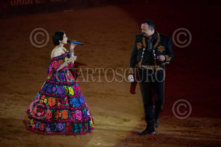 Ángela Aguilra en un dueto junto a su papá Pepe Aguilar durante su presentación en el "Jaripeo sin fronteras", en la Plaza México.