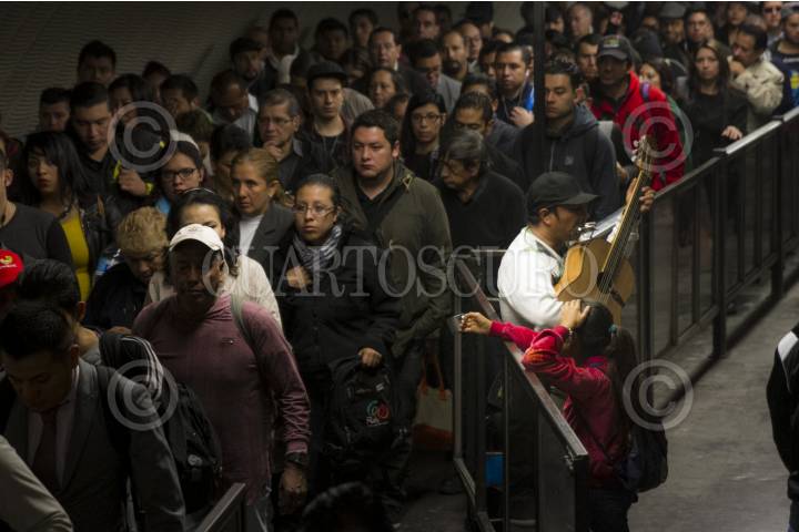 CIUDAD DE MÉXICO, 21JULIO2016.- Mientras el padre toca la guitarra y la armónica, su hija pide en una pequeña tacita de metal cooperación por la música, mientras, los viajeros del metro apresuran el paso para llegar en a sus destinos. FOTO: MOISÉS PABLO /CUARTOSCURO.COM