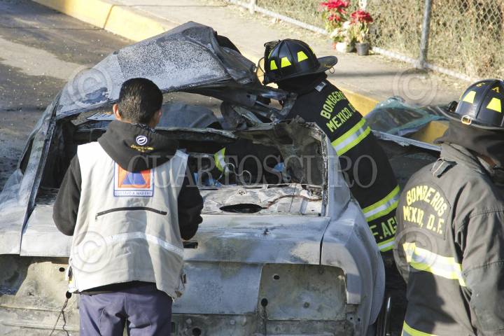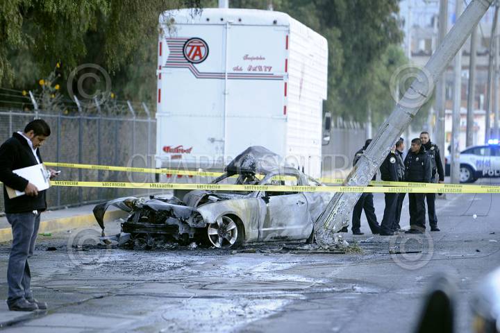 MÉXICO, D.F., 21DICIEMBRE2011.- Un hombre perdió la vida al impactarse con su auto Mustang en un poste de alta tensión. El auto se incendió. Los bomberos arribaron a las avenidas Tecnológico y Pino en la colonia Zona Escolar en Cuautepec, Gustavo A. Madero, para sofocar el fuego y rescatar el cuerpo del conductor. FOTO: LUIS CARBAYO/CUARTOSCURO.COM