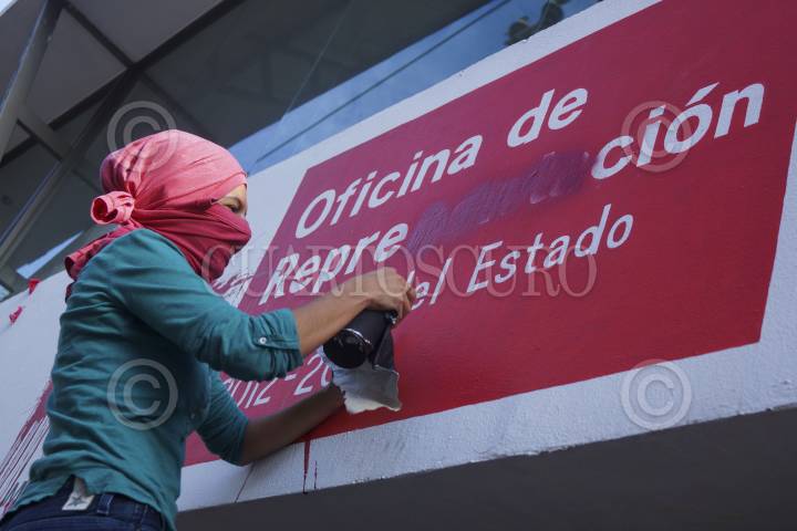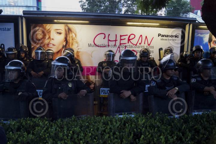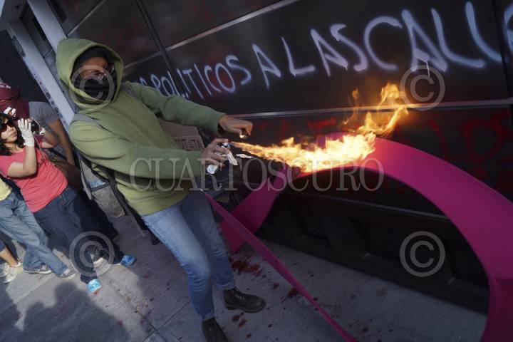 MÉXICO, D.F. 17OCTUBRE2012.- Decenas de personas se manifestaron afuera de la representación del estado de Michoacán, ubicada en la colonia Nápoles, para pedir la liberación de los normalistas detenidos el pasado lunes en ese estado en un desalojo de las Normales. Los inconformes pintaron consignas en el edificio, y se dirigieron hacia la avenida Insurgentes en donde bloquearon la circulación de norte a sur, provocando que las unidades de los metrobuses que viajan por esta arteria bajaran a los pasajeros. Granaderos acudieron al lugar para habilitar el transito por esta concurrida vialidad. FOTO: PEDRO ANZA /CUARTOSCURO.COM