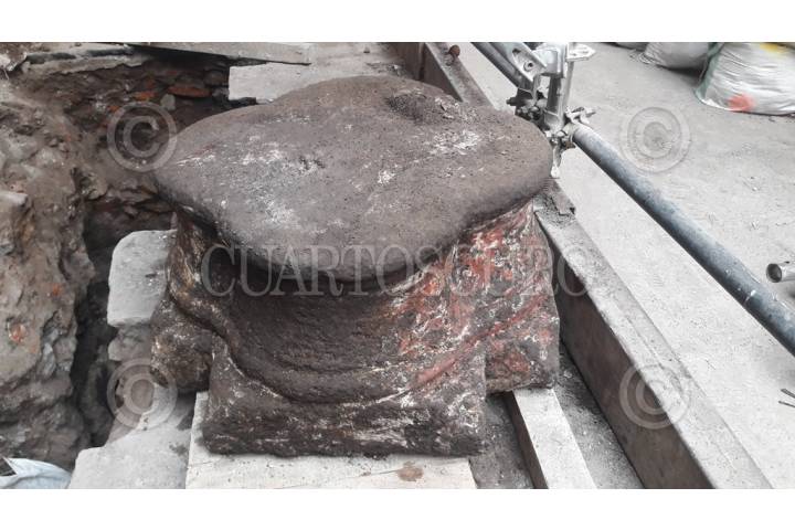 Basa que se localizó in situ que formaba parte de un pórtico y que al mismo tiempo servía de límite de un patio de la casa de Hernán Cortés en El Nacional Monte de Piedad. Foto: Oliver Santana/Nacional Monte de Piedad.