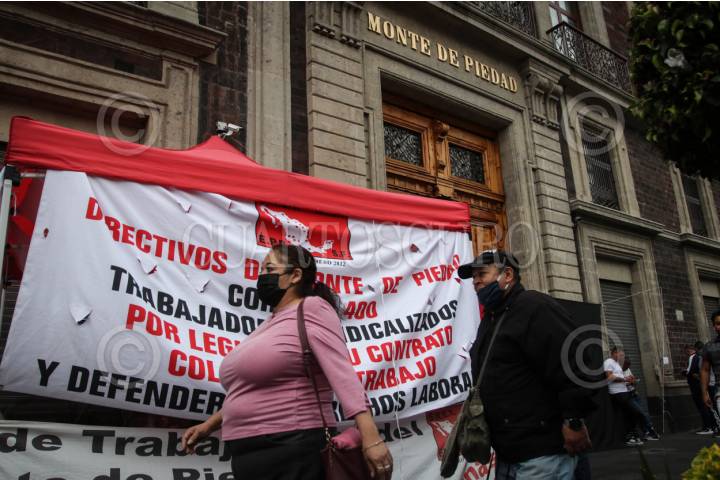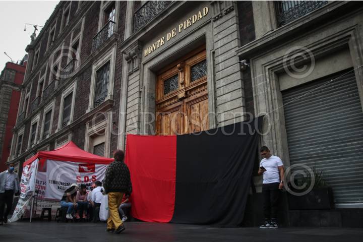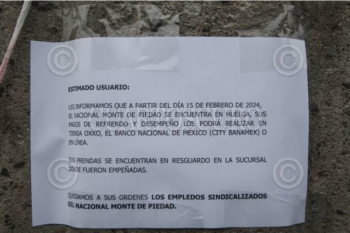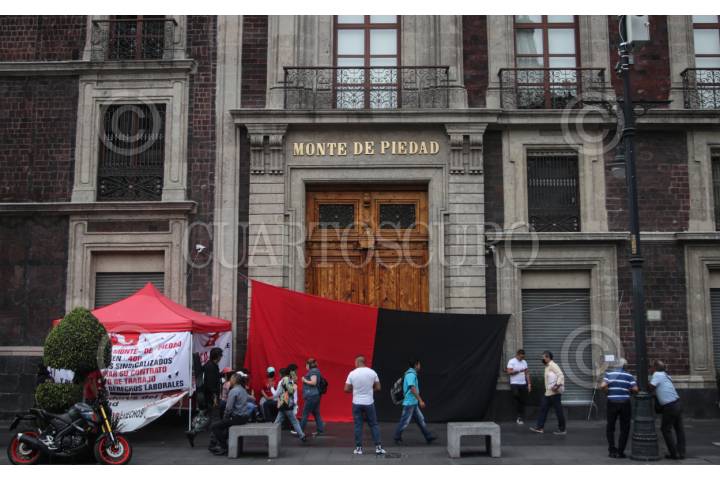 CIUDAD DE MÉXICO, 15FEBRERO2024.- El Sindicato del Nacional Monte de Piedad, la mayor casa de empeños en México y la institución financiera más antigua de América, comenzó este jueves una huelga por desacuerdos sobre el nuevo contrato colectivo. La sucursal del Zócalo Capitalino se encuentra cerrada y con personal afuera con mantas. FOTO: ANDREA MURCIA /CUARTOSCURO.COM