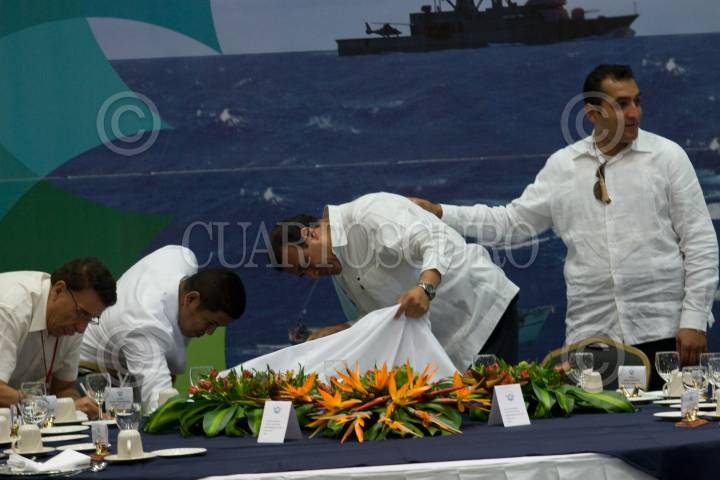 C.D. MADERO, TAMAULIPAS. 01JUNIO2010.- Elementos del Estado Mayor rebizan hasta debajo de la mesa donde ocupara el lugar el Presidente de México, esto momentos antes del desayuno por el 68 Aniversario del Día de la Marina. FOTO: GUILLERMO PEREA/CUARTOSCURO.COM