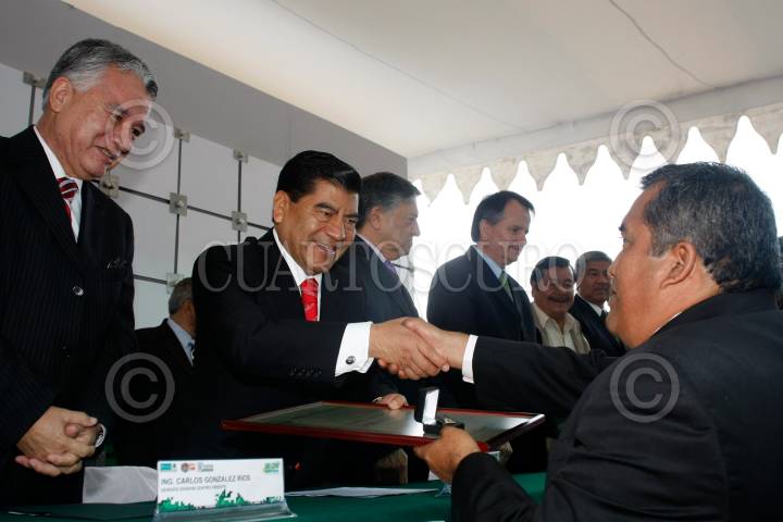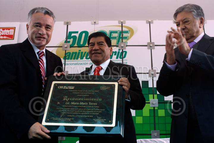 PUEBLA, PUEBLA 27SEPTIEMBRE2010.- La Comisión Federal de Electricidad división centro oriente, realizó una ceremonia para conmemorar el 50 aniversario de la Nacionalización de la Industria Eléctrica, la cual estuvo presidida por Carlos González Ríos, gerente de la división centro oriente; el mandatario poblano, Mario Marín Torres Gobernador de está entidad y Víctor Manuel Carreto Fernández de Lara, coordinador regional del SUTERM. Durante la ceremonia los funcionarios hicieron entrega de la presea "Adolfo López Mateos" a los trabajadores más destacados de la institución eléctrica. FOTO: FRANCISCO GUASCO/CUARTOSCURO.COM