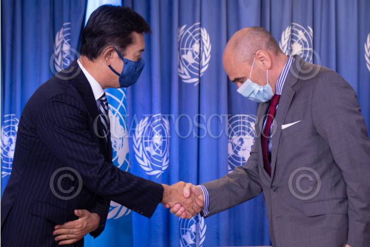 Lorenzo Jiménez de Luis, representante residente del PNUB en México, y Noriteru Fukushima, embajador de Japón en México, encabezaron el anuncio del proyecto “Empresa y derechos humanos en México”, en la sala Mario Molina del Programa de las Naciones Unidas para el Desarrollo. El proyecto busca equiparar el entendimiento entre empresas para la prevención de trabajo forzado, acaparamiento de tierras y discriminación.