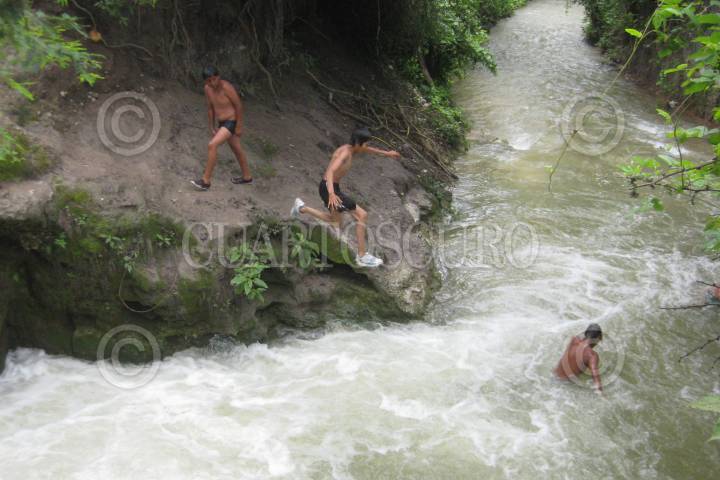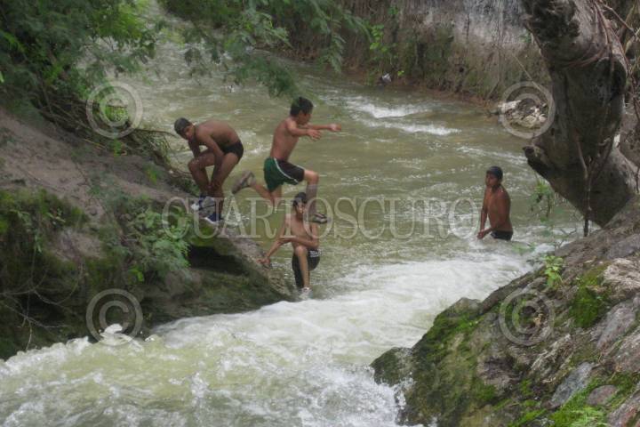 HUACAPA, GUERRERO, 27JULIO2011.- Un grupo de niños se divierten aventandose clavados en el cauce del rio Huacapa, aprovechando el desfogue de agua en la presa "Cerrito Rico", que llevan a cabo autoridades municipales con la finalidad de evitar alguna contingencia. FOTO: OSCAR ALVARADO/CUARTOSCURO.COM
