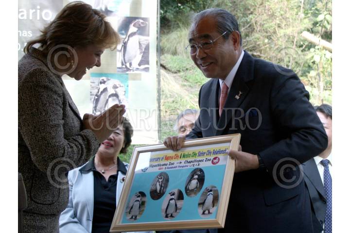 MÉXICO,D,F.,30 OCTUBRE2007.- Martha Delgado secretaria de medio ambiente del Distrito Federal, recibe de manos del Embajador de Nagoya Takehisa Matsabura la entrega simbólica de cinco pingüinos de Humbolt, los cuales llegaran al país el año próximo FOTO: SASHENKA GUTIERREZ/CUARTOSCURO.COM