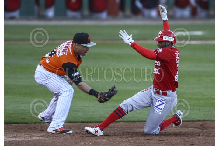 HERMOSILLO, SONORA, 27DICIEMBRE2015.- Jerry Owens y Jorge Flores en las bases, durante el tercer juego de la Serie entre Tomateros de Culiacán vs Naranjeros de Hermosillo en el Estadio Sonora. Segunda vuelta de la Liga Mexicana del Pacifico (LMP). FOTO: MARGARITA GARCÍA /CUARTOSCURO.COM