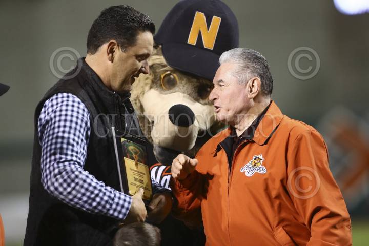 HERMOSILLO, SONORA, 15ENERO2017.- Erubiel Durazo recibió un reconocimiento por parte de Arturo Leon Lerma y Juan Aguirre por su carrera y su introducción al Pabellón de la Fama de la Confederación del Carib , durante el tercer partido de beisbol entre Naranjeros vs Aguilas de Mexicali. Serie semifinal de los playoffs de la Liga Mexicana del Pacifico LMP 20016-2017. FOTO: LUIS GUTIÉRREZ /CUARTOSCURO.COM