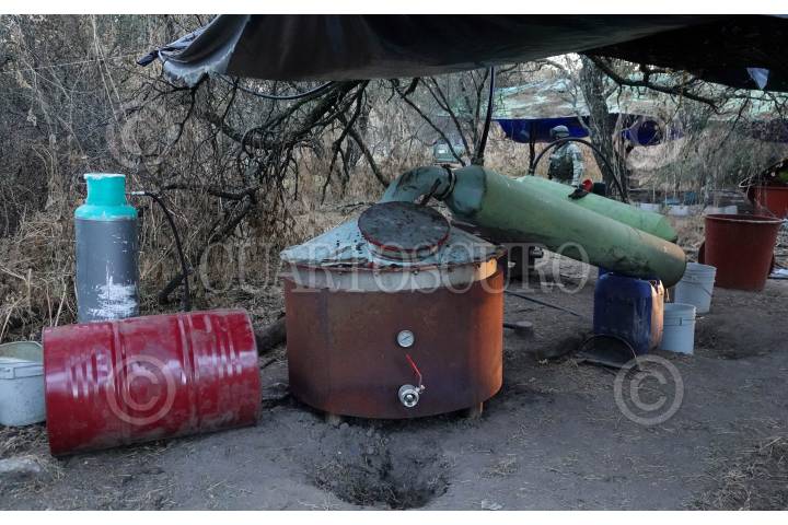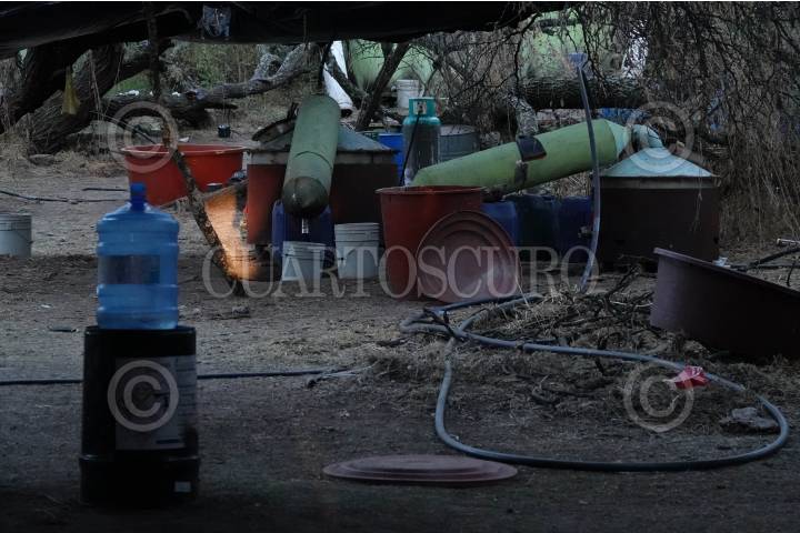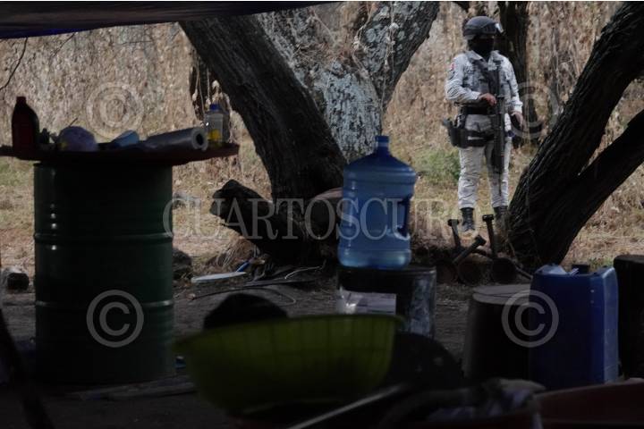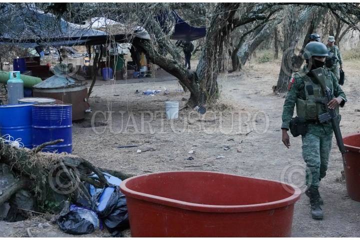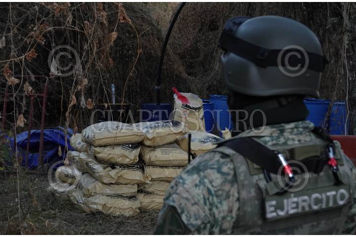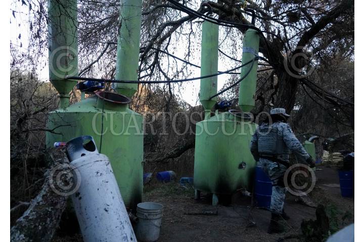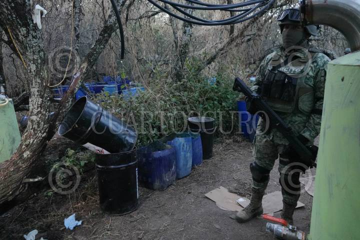 ACAMBARO, GUANAJUATO, 26NOVIEMBRE2024.- Elementos de la Guardia Nacional en conjunto con el Ejército Mexicano lograron el aseguramiento y desmantelación de un narcolaboratorio de aproximadamente 200 metros cuadrados en el poblado de Andocutin, límites entre los estados de Guanajuato y Michoacán. Durante la operación se incautaron 4 toneladas de precursores químicos que equivalen a 6 millones de dosis entre 0.5 y 1 gramos de metanfetaminas y otro tipo de drogas químicas, en un periodo de entre 30 y 40 días. FOTO: GALO CAÑAS/CURTOSCURO.COM