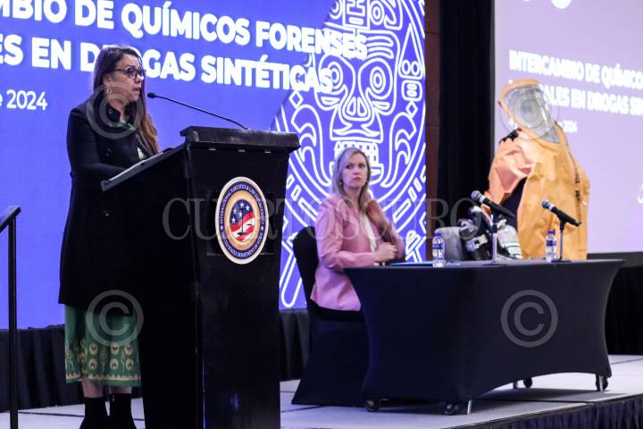 CIUDAD DE MÉXICO, 04DICIEMBRE2024.- Katie Stana, directora de la Oficina de Asuntos Antinarcóticos y Aplicación de Ley de la embajada de Estados Unidos y Mavil López Casamichana, encargada de la Unidad de Laboratorios Criminalísticos en el Centro Federal Pericial Forence de la Agencia de Investigación Criminal de la Fiscalía General de la República, encabezaron la apertura del Intercambio de Químicos Forenses y Fiscales en Drogas Sintéticas. Lo anterior, como parte de la relación bilateral para enfrentar el trasiego de drogas de origen químico. FOTO: CUARTOSCURO.COM