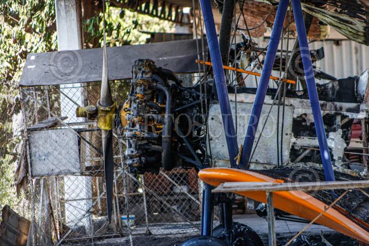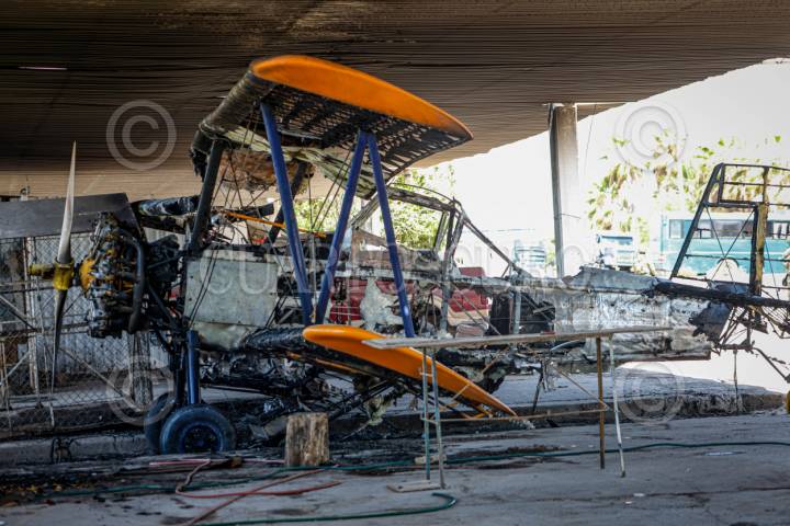 NAVOLATO, SINALOA, 26JUNIO2025.- Una avioneta Stearman de la Segunda Guerra Mundial fue destruida tras un ataque registrado la tarde de este jueves en la pista La Luna, ubicada en la sindicatura de Villa Juárez, Navolato. Sujetos armados irrumpieron en el aeródromo, abrieron fuego contra la aeronave, le prendieron fuego antes de huir con rumbo desconocido. Testigos relataron que escucharon varias detonaciones, seguidas de una explosión y el incendio de la aeronave, el saldo fue de cuantiosos daños materiales sin ninguna persona lesionada. El pasado 28 de abril ya había sido atacada a balazos el mismo aeródromo, en la cual resultó afectada otra avioneta. FOTO: JOSÉ BETANZOS ZÁRATE/CUARTOSCURO.COM