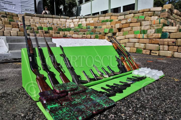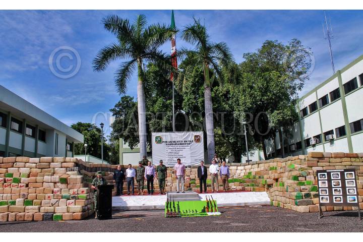 CULIACÁN, SINALOA, 05OCTUBRE2015.- En la explanada de las instalaciones de la Novena Zona Militar, fue presentado el aseguramiento de aproximadamente 24 toneladas de marihuana, 10 kilos de droga conocida como ¨cristal¨, 13 armas largas y 7 cortas, entre otros artículos. El evento fue encabezado por el gobernador del estado Mario López Valdez. FOTO: CUARTOSCURO.COM