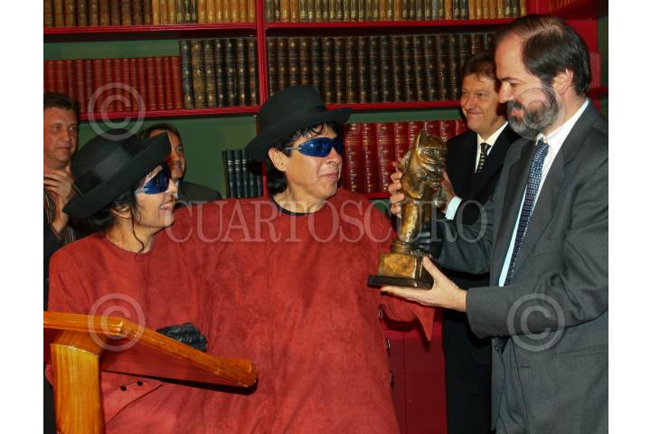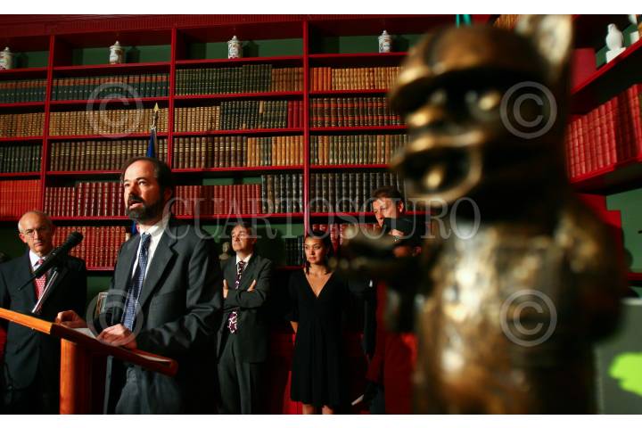 MEXICO, D.F., 05MARZO2008.- El escritor Juan Villoro, recibió el V premio de narrativa Antonio Artaud, en la Residencia de Francia, que incluye la traducción de su libro de cuentos Los Culpables, un cheque en efectivo. En la imagen lo acompañan el embajador frances Alain Le Gourrierec. FOTO: MOISÉS PABLO/CUARTOSCURO.COM