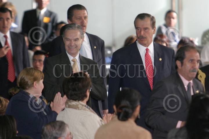 MEXICO, D.F. 28FEBRERO2005.- El presidente Vicente Fox y el canciller Luis Ernesto Derbez, al término de la ceremonia de entrega de cartas de naturalización, en la sede de la secretaria de Relaciones Exteriores. FOTO: Nelly Salas/CUARTOSCURO.COM