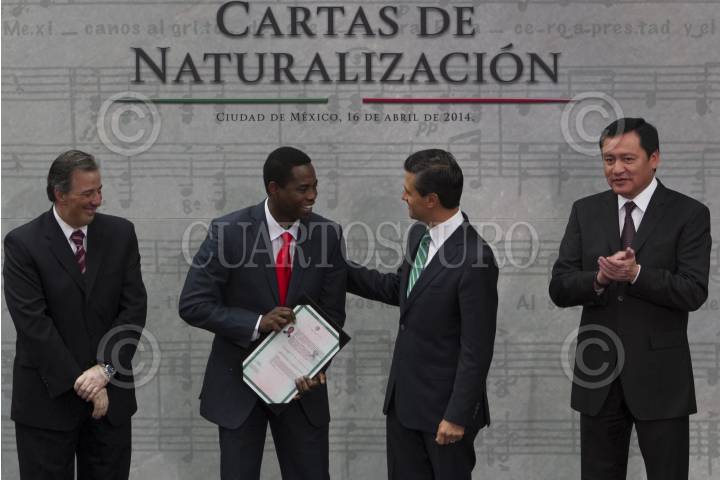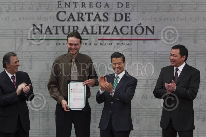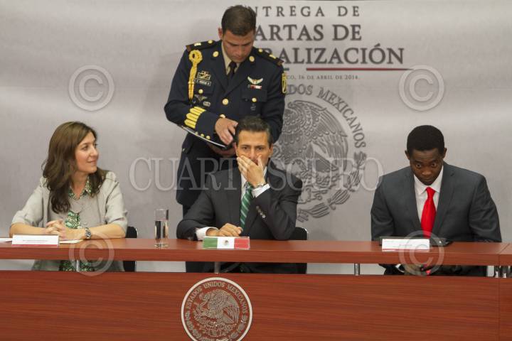 MÉXICO, D.F., 16ABRIL2014.- Enrique Peña Nieto, Presidente de México, acompañado de Miguel Ángel Osorio Chong, titular de la secretaria de Gobernación y José Antonio Meade Kuribreña, titular de la Secretaria de Relaciones Exteriores, encabezo la ceremonia de entrega de Cartas de naturalización a 21 extranjeros de las 154 que otorgo el gobierno. FOTO: GUILLERMO PEREA /CUARTOSCURO.COM
