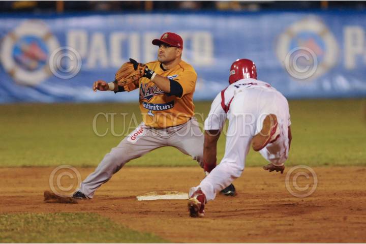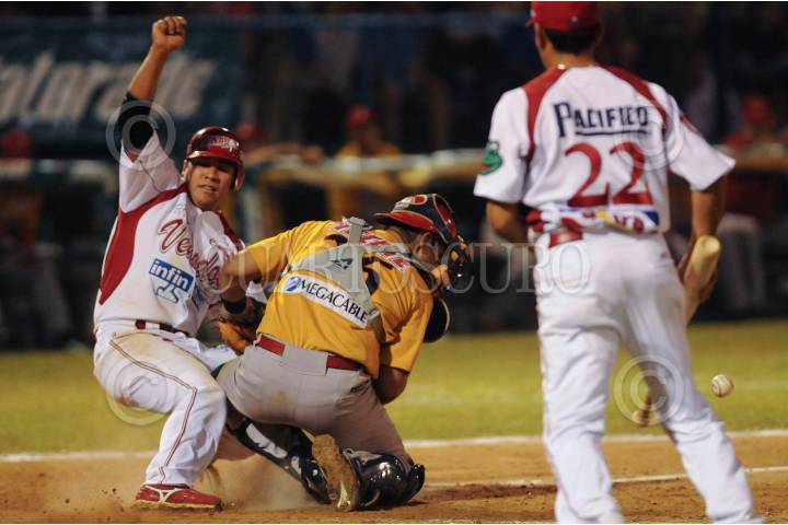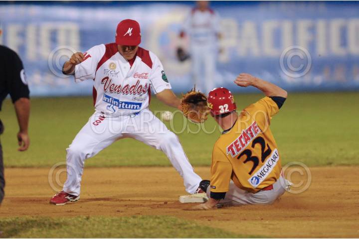 MAZATLÁN, SINALOA, 14NOVIEMBRE2009.- Franciso Arias, de los Mayos de Navojoa, espera la bola mientras Ruben Rivera, de los Venados de Mazatlán, se barre hacia la base, durante el primer partido de la serie con una blanqueada de los locales de 6 carreras a 0, ayer por la noche. FOTO: PATRICIA MEJÍA/EL DEBATE DE MAZATLÁN/CUARTOSCURO.COM