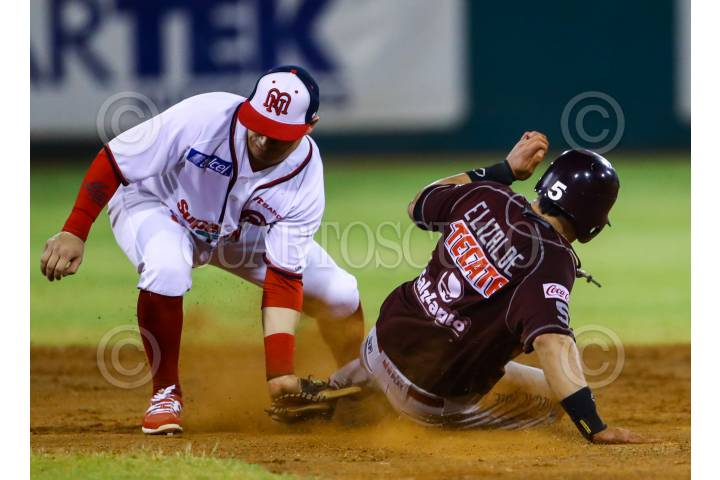 MAZATLÁN, SINALOA, 14NOVIEMBRE2009.- Heber Gómez, de los Venados de Mazatlán, se barre para robar la cuarta base a Adán Muñoz, de los Mayos de Navojoa, durante el primer partido de la serie con una blanqueada de los locales de 6 carreras a 0, ayer por la noche. FOTO: PATRICIA MEJÍA/EL DEBATE DE MAZATLÁN/CUARTOSCURO.COM