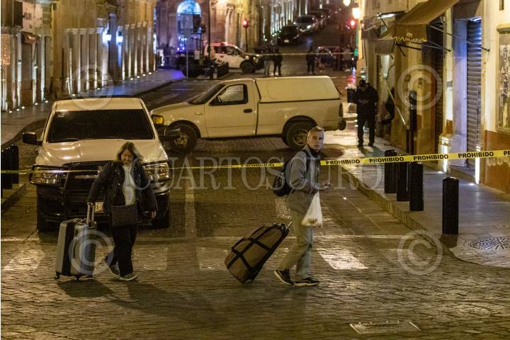 Turistas extranjeros buscan su hotel junto al acordonamiento policiaco de la escena del crimen en dónde dos hombres fueron asesinados a balazos, en el interior de un bar en pleno centro histórico de Zacatecas.