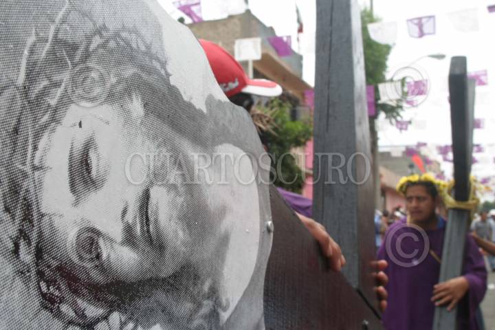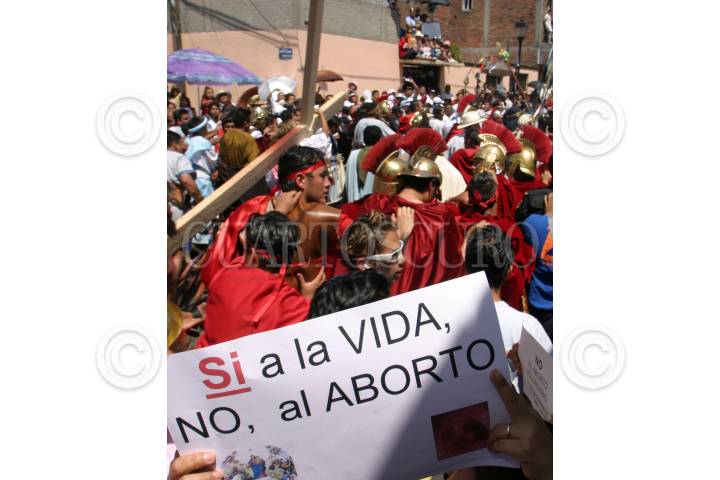 MÉXICO, D.F., 06ABRIL2007.- Mujeres católicas se manifestaron con letreros en contra del aborto y a favor de la vida, durante el paso de la procesión del Nazareno hacia el golgota en la representación que cada año los habitantes de Iztapalapa realizan. FOTO: MOISÉS PABLO/CUARTOSCURO.COM