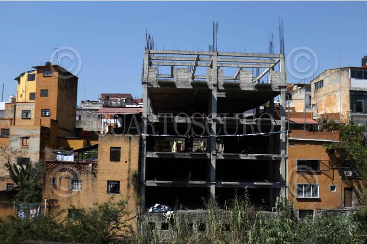 Un pequeño edificio en obra negra en el centro de la ciudad es la imagen de la crisis económica que se vive.