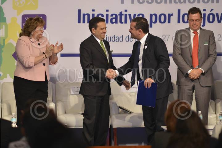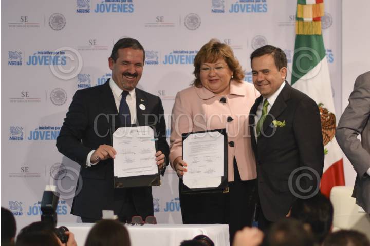 MÉXICO, D.F., 27FEBRERO2015.- Marcelo Melchior, Presidente Ejecutivo y Presidente de Consejo de Administración de Nestlé México Y Ildefonso Guajardo, Secretario de Economía, durante la firma de convenio "Iniciativa por los jóvenes"entre Nestlé y la Secretaria. FOTO: ADOLFO VLADIMIR /CUARTOSCURO.COM