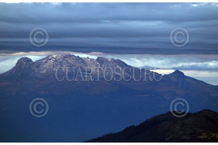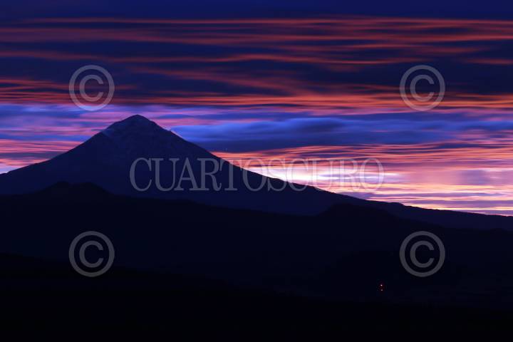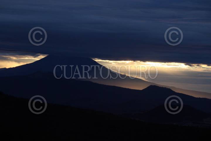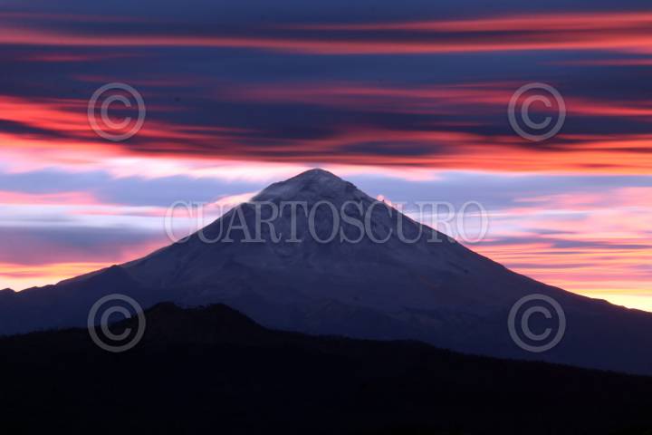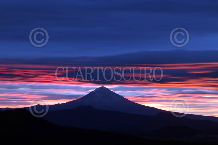 El frente frio no 29 afecta a casi todo el pais con bajas temperaturas, bancos de niebla, lluvias y nevadas. Imagen del amanecer con el volcan Iztaccihuatl cubierto de nubes y colores espectaculares.