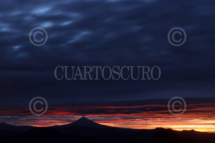 El frente frio no 29 afecta a casi todo el pais con bajas temperaturas, bancos de niebla, lluvias y nevadas. Imagen del amanecer con el volcan Popocatepetl cubierto de nubes y colores espectaculares.