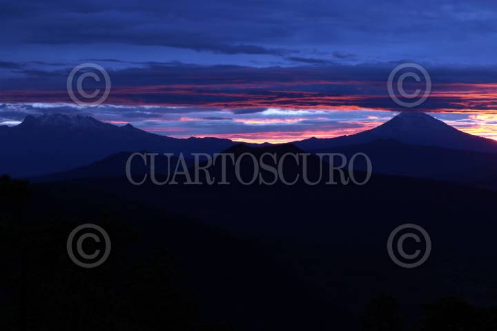 El frente frio no 29 afecta a casi todo el pais con bajas temperaturas, bancos de niebla, lluvias y nevadas. Imagen del amanecer con el volcan Popocatepetl e Iztaccihuatl cubiertos de nubes y colores espectaculares.