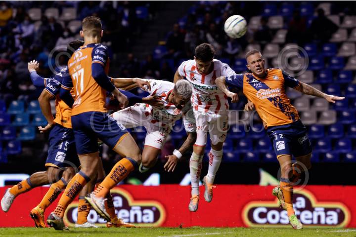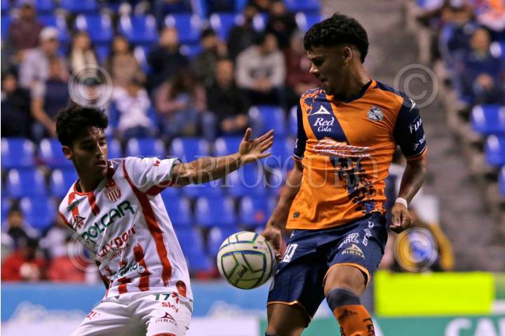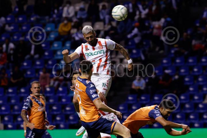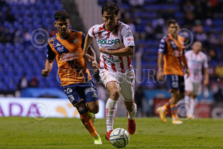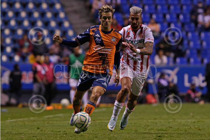Maximiliano Araujo y Fernando Madrigal durante el partido entre el Club Puebla y los Rayos del Necaxa correspondiente a la jornada 9 del torneo Apertura 2022 de la Liga BBVA MX.