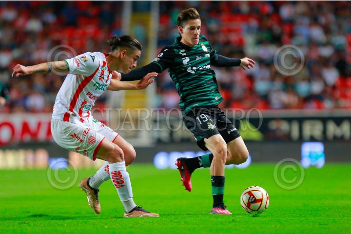 Josecarlos Van Rankin del Necaxa y Juan Brunetta del Santos durante el juego de la jornada 13 del Torneo Clausura 2023 de la Liga BBVA MX en el Estadio Victoria.