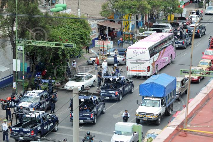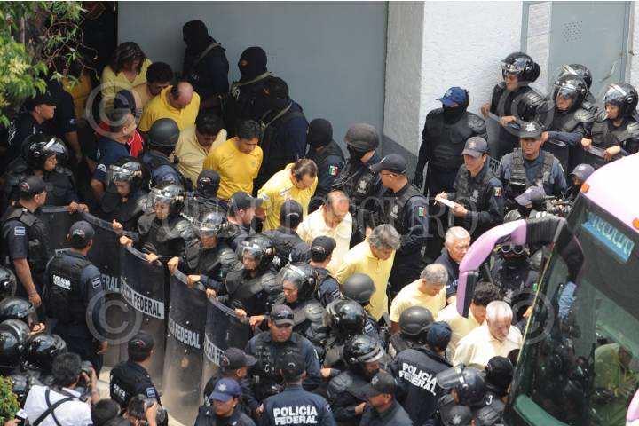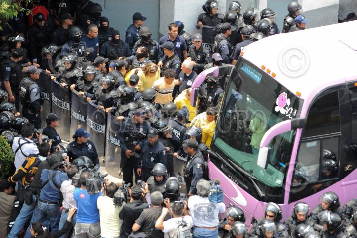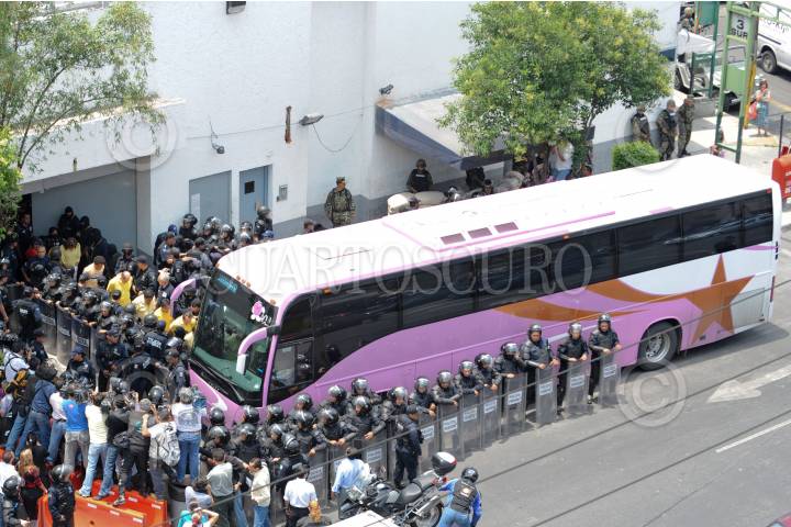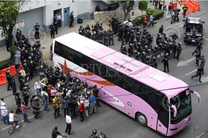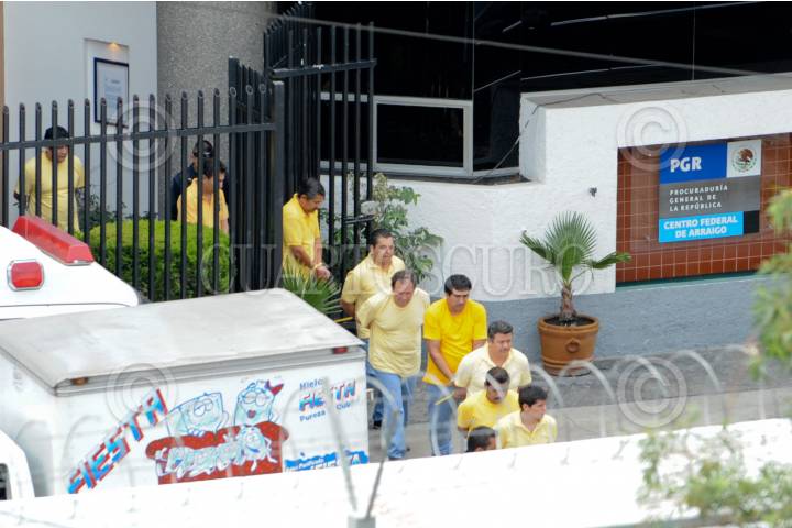 MÉXICO, D.F., 19JUNIO2009.- 27 de los 30 funcionarios michoacanos, entre ellos diez alcaldes, fueron consignados por sus nexos con el cartel del La Familia. Esta tarde fueron trasladados del Centro Federal de Arraigo de la PGR en un autobús de color rosa bajo un fuerte operativo en el que participaron Policías Federales y Militares a el Aeropuerto Internacional de la Ciudad de México para ser llevados a Nayarit. FOTO: LUIS CARBAYO/CUARTOSCURO.COM