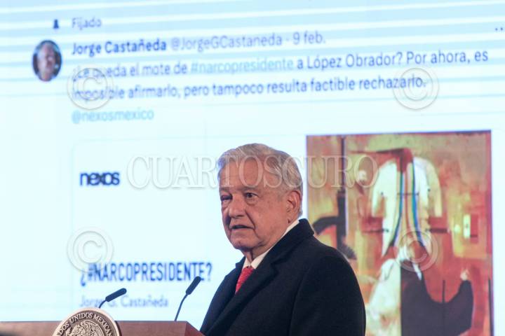 CIUDAD DE MÉXICO, 12FEBRERO2024.- Andrés Manuel López Obrador, Presidente de México, muestra un Twitter de José Castañeda en la cual se muestra la portada de la Revista Nexos que llega la interrogante "Narcopresidente", esto durante la mañanera. FOTO: MOISÉS PABLO/CUARTOSCURO.COM