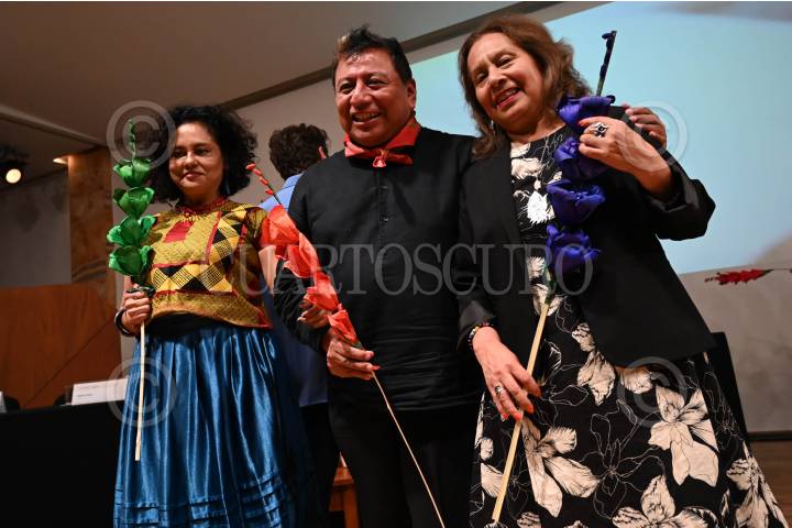 CIUDAD DE MÉXICO, 28MAYO2024.- Maradonio Carballo, acompañado de Lucinda Jiménez y Natalia Toledo, durante la presentación del libro La Canción de las Flores. FOTO: DANIEL AUGUSTO/ CUARTOSCURO.COM