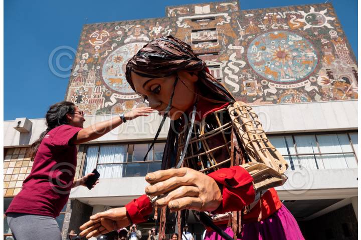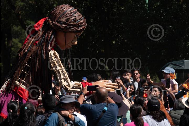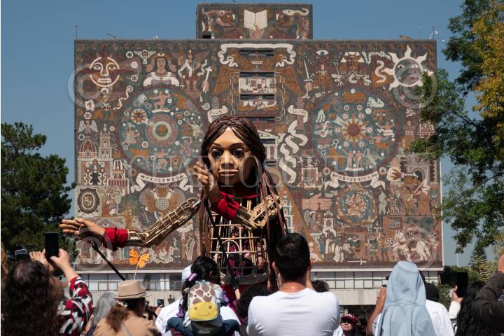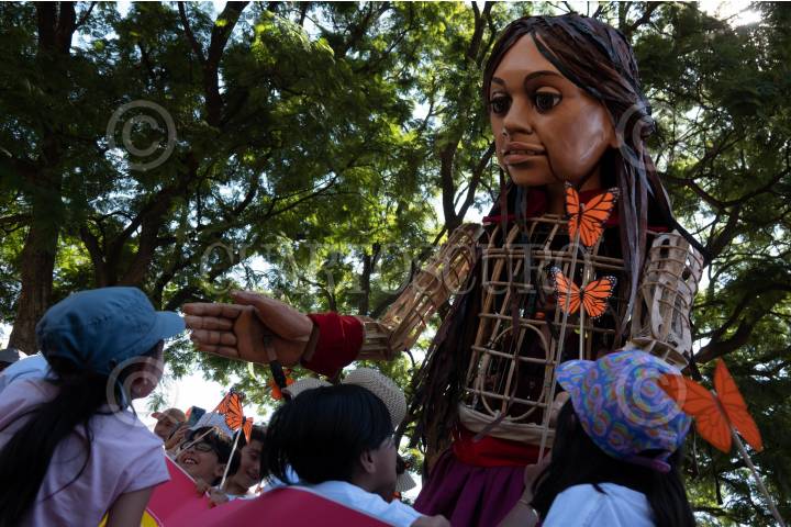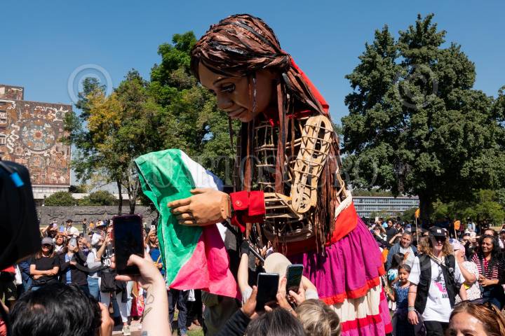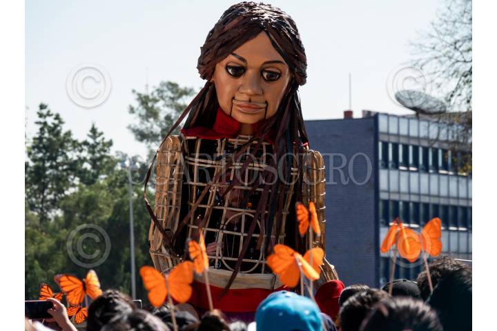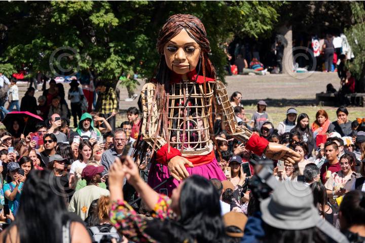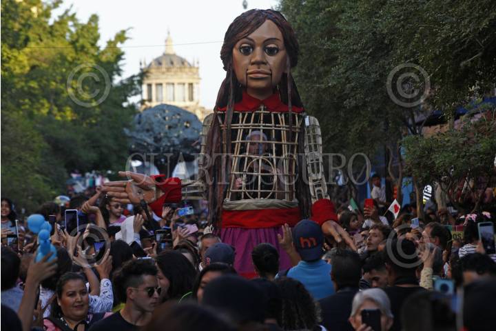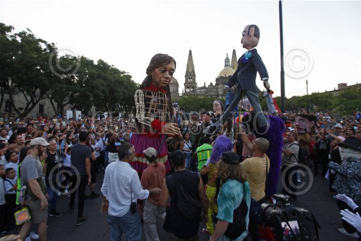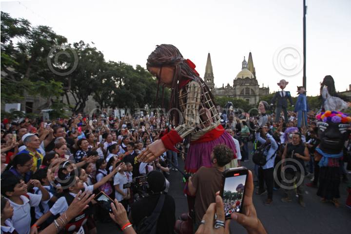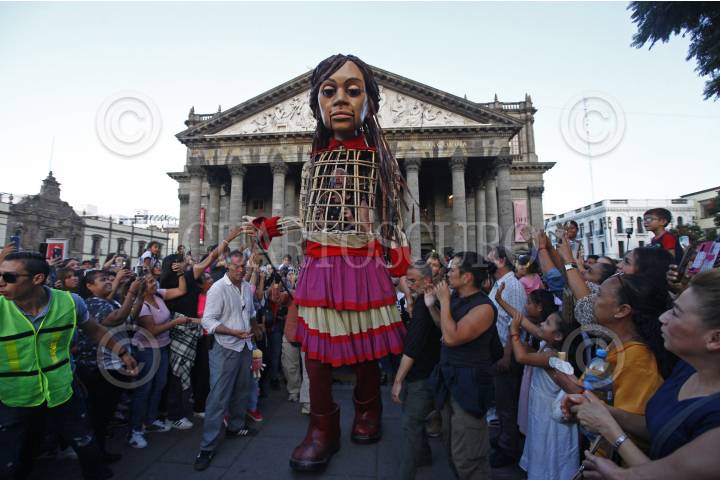 GUADALAJARA, JALISCO, 14NOVIEMBRE2023.- Hoy llego a la ciudad Amal, la marioneta de 3.6 metros de altura, misma que representa a una niña Siria de 10 años de edad y el mensaje en sus recorridos es crear conciencia en los desafíos que representa la migración en el mundo, principalmente para los menores de edad que tienen que dejar su país buscando reunirse con su familia y terminan siendo refugiados huyendo de la Guerra. Amal a recorrido 15 países y busca convertirse en un símbolo mundial de los derechos humanos. FOTO: FERNANDO CARRANZA GARCIA / CUARTOSCURO.COM