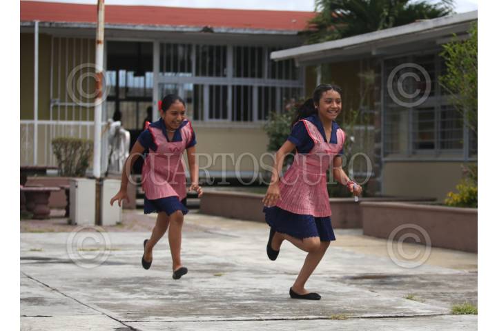 TEMIXCO, MORELOS, 05SEPTIEMBRE2025.- Conmemoración del Día Internacional de la Mujer Indígena por parte del gobierno del estado en la Escuela Primaria Miguel Othón de Mendizábal, en la comunidad de Cuentepec. El evento consistió en un maratón de lectura estuvo encabezado por el secretario de Educación Mario Delgado y la gobernadora Margarita González Saravia. En la imagen, niñas juegan al final del evento. FOTO: MARGARITO PÉREZ RETANA/CUARTOSCURO.COM