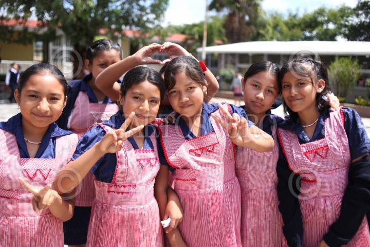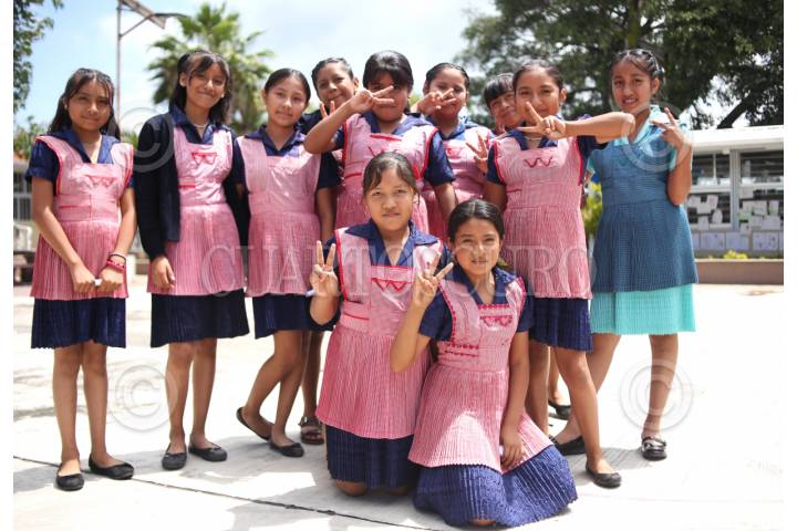 TEMIXCO, MORELOS, 05SEPTIEMBRE2025.- Conmemoración del Día Internacional de la Mujer Indígena por parte del gobierno del estado en la Escuela Primaria Miguel Othón de Mendizábal, en la comunidad de Cuentepec. El evento consistió en un maratón de lectura estuvo encabezado por el secretario de Educación Mario Delgado y la gobernadora Margarita González Saravia. En la imagen, niñas indígenas posan para una foto grupal que pidieron. FOTO: MARGARITO PÉREZ RETANA/CUARTOSCURO.COM