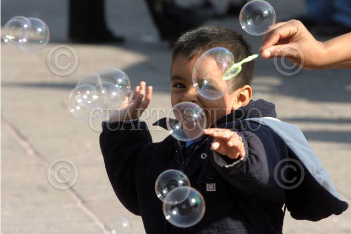 MÉXICO, D.F., 03ENERO2008.- Un niño se divierte jugando con las burbujas hechas por una vendedora en la feria de navideña que se ubica en la explanada del Monumento a la Revolución. FOTO: MOISÉS PABLO/CUARTOSCURO.COM