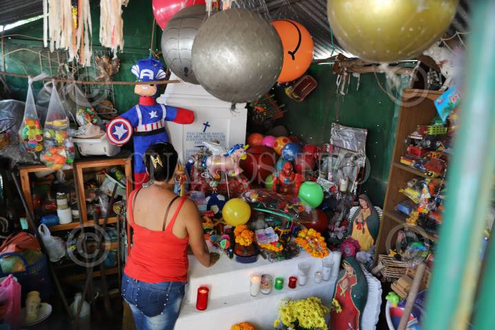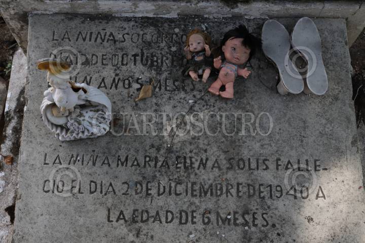 ACAPULCO, GUERRERO, 28OCTUBRE2018.- Decenas de juguetes rodean la tumba de Raúl González un niño que murió a los 10 meses de nacido en el año 1933 y que fue sepultado en el panteón San Francisco en Acapulco el mas antiguo del puerto, en donde personas llegan a dejarle juguetes y hacerle rezos para pedirle un milagro, la señora Susana quien es la administradora del panteón y quien se encarga de cuidar la tumba cuenta que la devoción de las personas empezó hace varios años cuando una señora acudió a buscar alguna tumba abandonada de algún niño niño, para rezar y pedir la salud de su pequeña hija luego de tener una revelación en donde la virgen le pedía que hiciera eso para que su hija de sanara. FOTO: CARLOS ALBERTO CARBAJAL /CUARTOSCURO.COM