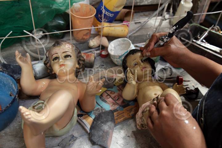 Reparadores de imágenes religiosas se encuentra trabajando en el estacionamiento del Parque Luis Donaldo Colosio, imágenes de Niños Dios de todos tamaños reparan días previos al Día de la Candelaria.