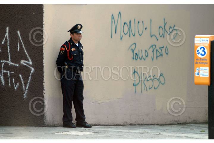 MÉXICO, D.F., 14AGOSTO2007.- Un polícia monta guardia en las calles nilo y atzcapozalco de la colonia claveria, esperando a que el Sr. Raúl Nava González saliera de su domicilio para entregarle una notificación de arresto administrativo por haber conducido en estado de ebriedad el pasado 04 de marzo. FOTO: CLAUDIA ARÉCHIGA/CUARTOSCURO.COM