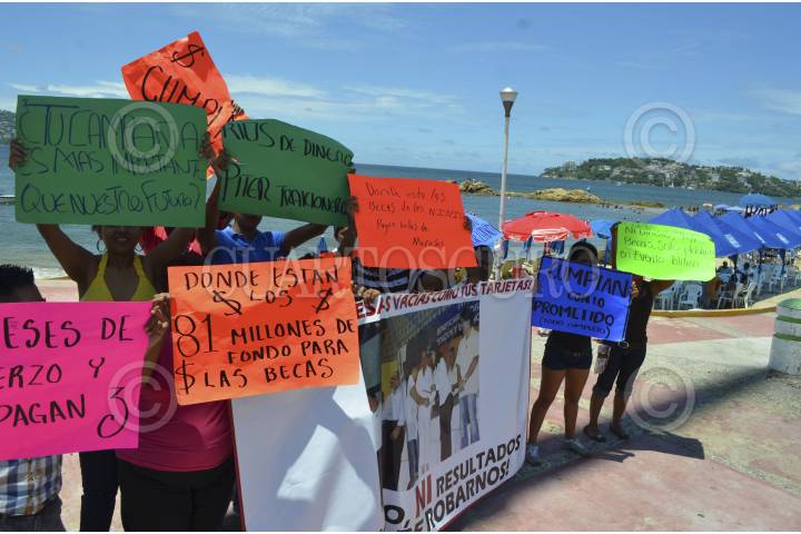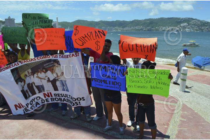 ACAPULCO, GUERRERO, 18JUNIO2012.- Alrededor de 20 jóvenes considerados como ninis por las autoridades (jóvenes que ni estudian ni trabajan), se manifestaron en el asta bandera, en la costera Miguel Alemán, para exigir el pago pendiente por concepto de seis meses de servicio correspondiente al programa piloto de becas de capacitación y estancia en el sector productivo, de la Secretaría de Educación Pública, iniciativa puesta en marcha por el gobierno federal el año pasado, con el objetivo de abrir espacios de oportunidad a jóvenes egresados de universidades públicas y privadas sin empleo. FOTO: BERNANDINO HERNÁNDEZ /CUARTOSCURO.COM