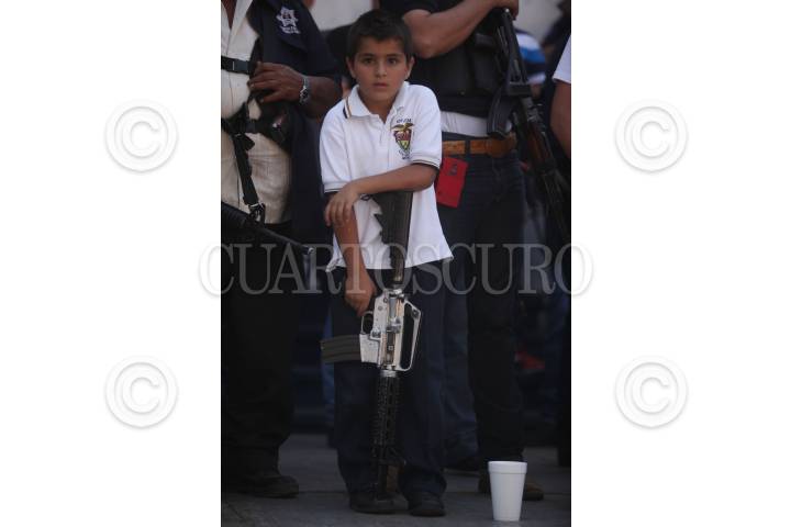 LOS REYES, MICHOACÁN, 28ENERO2015.- El día de hoy más de 100 elementos adscritos a la Fuerza Rural, festejaron el primer aniversario de haber ingresado a la cabecera municipal. Los elementos realizaron un recorrido por las principales calles en caravana y finalizaron con un evento en donde algunos de los comandantes se dirigieron al pueblo. FOTO: ALAN ORTEGA /CUARTOSCURO.COM